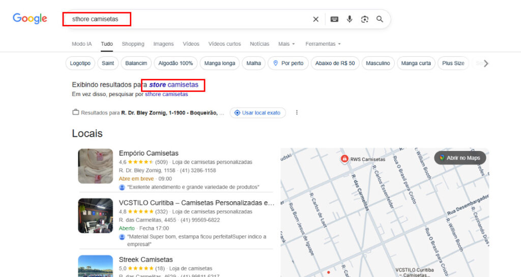 Ao buscar por “sthore camisetas”, o Google sugeria “store camisetas”. Não era erro do site. Era ausência de entidade consolidada.